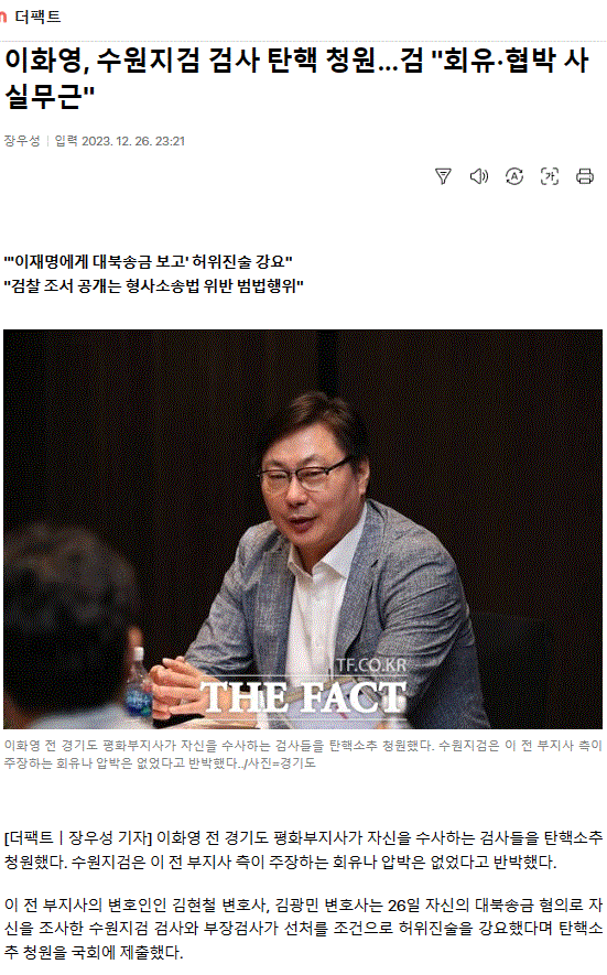 이화영, 수원지검 검사 탄핵 청원…검 "회유·협박 사실무근"
