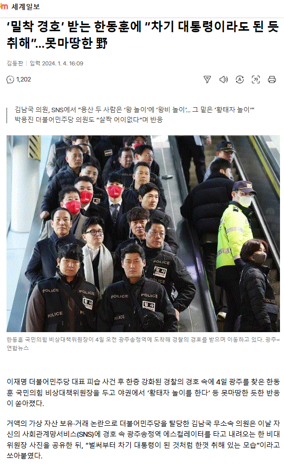 ‘밀착 경호’ 받는 한동훈에 “차기 대통령이라도 된 듯 취해”…못마땅한 野