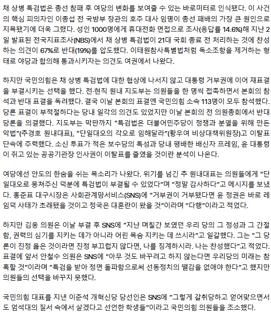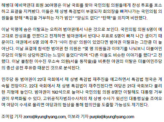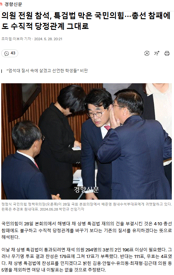 의원 전원 참석, 특검법 막은 국민의힘···총선 참패에도 수직적 당정관계 그대로
