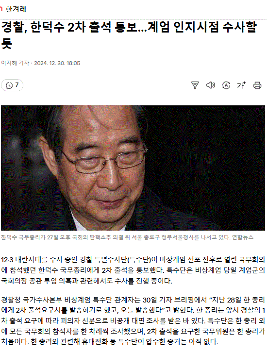 경찰, 한덕수 2차 출석 통보… 계엄 인지시점 수사할 듯 ㅡ 잘가라