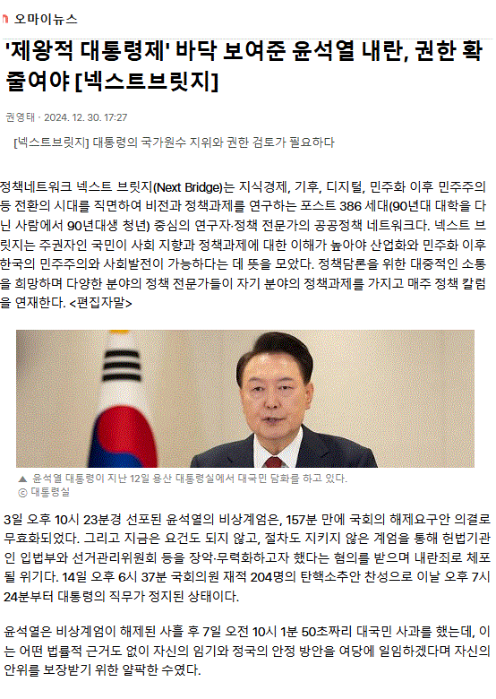 '제왕적 대통령제' 바닥 보여준 윤석열 내란, 권한 확 줄여야 [넥스트브릿지]