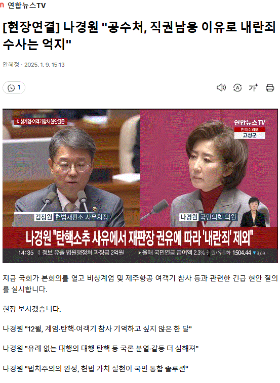 [현장연결] 나경원 "공수처, 직권남용 이유로 내란죄 수사는 억지"ㅡ 빠루사건은 1심선고 언제해
