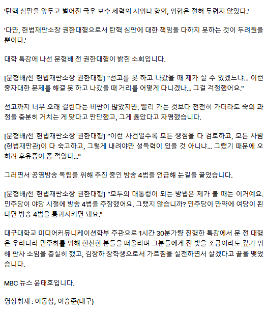 문형배 전 대행 "파면 선고는 최선의 결정‥ 방송4법 통과시켜야"