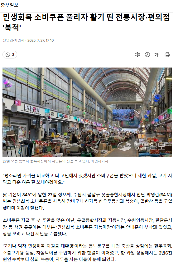 민생회복 소비쿠폰 풀리자 활기 띤 전통시장·편의점 '북적'