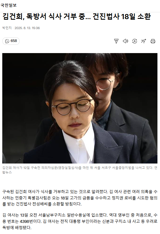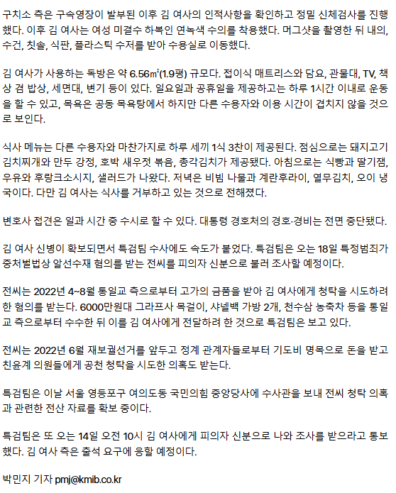김건희, 독방서 식사 거부 중… 건진법사 18일 소환