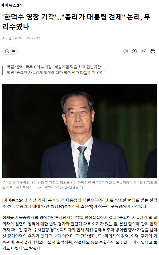 '한덕수 영장 기각'… "총리가 대통령 견제" 논리, 무리수였나 ㅡ 김엔장이 도왔을까