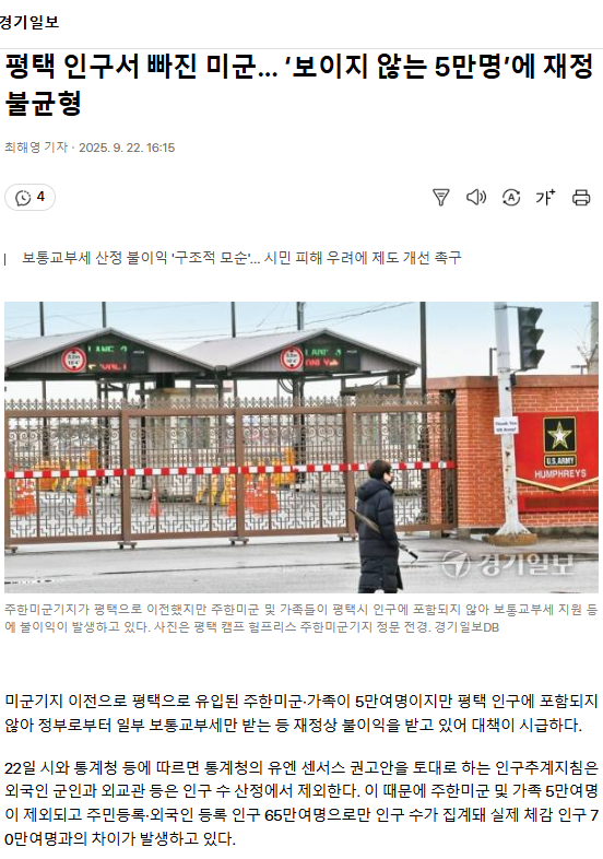 평택 인구서 빠진 미군… ‘보이지 않는 5만명’에 재정불균형 ㅡ 미군 가족이 5만 명이라는 말