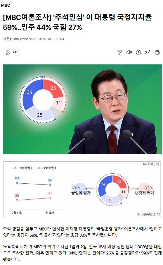 [MBC여론조사] '추석민심' 이 대통령 국정지지율 59%‥ 민주 44% 국힘 27% ㅡ 국힘은 너무 높네