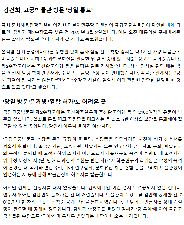 [단독] 김건희, 조선왕실유물 보관된 '비밀의 방' 수장고도 들어갔다... 출입자 명단에도 없어