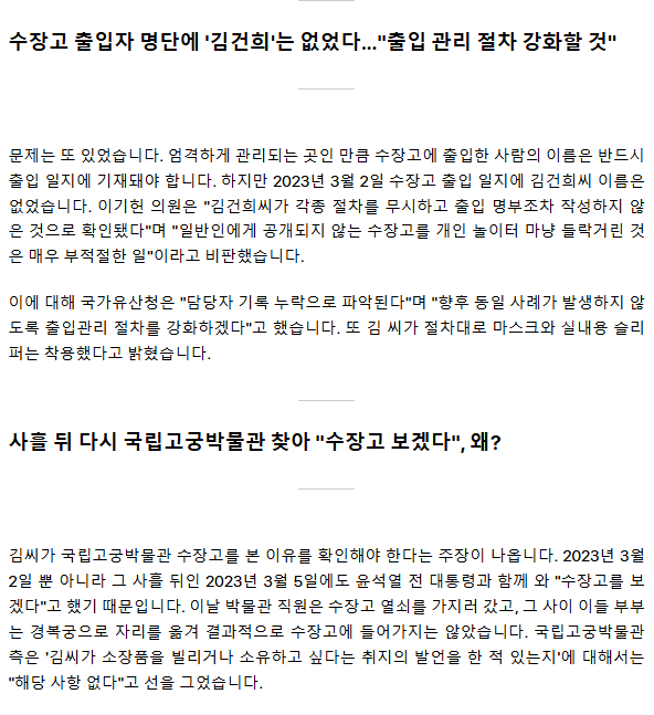 출입자 명단 작성하지 않은 공무원부터 징계하고 앞으로 이런 일이 재발하지 않게 조치를 하고 김건희 수장고에서 문화재 가지고 나가서 아직 반환하지 않았다고 재보가 있던데 철저하게 밝혀야 되겠네요 사악한 여자 하나가 나라를 다 망쳐 놨네요 ㅉ