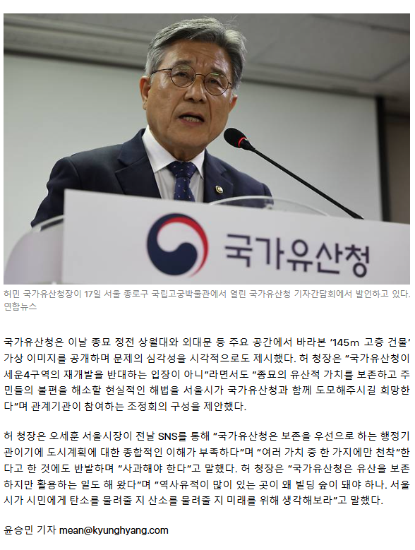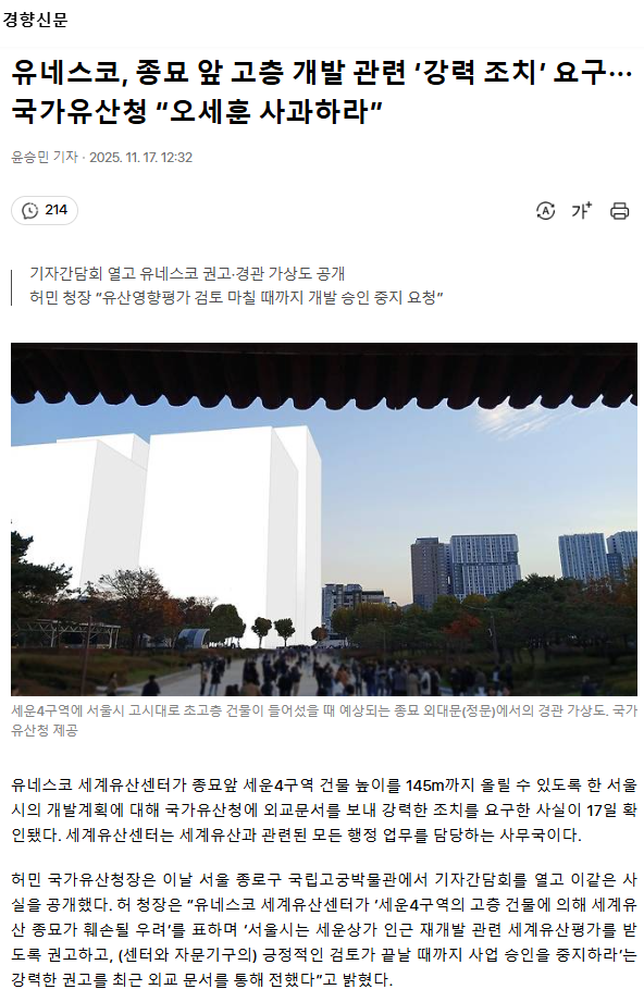 유네스코, 종묘 앞 고층 개발 관련 ‘강력 조치’ 요구··· 국가유산청 “오세훈 사과하라”
