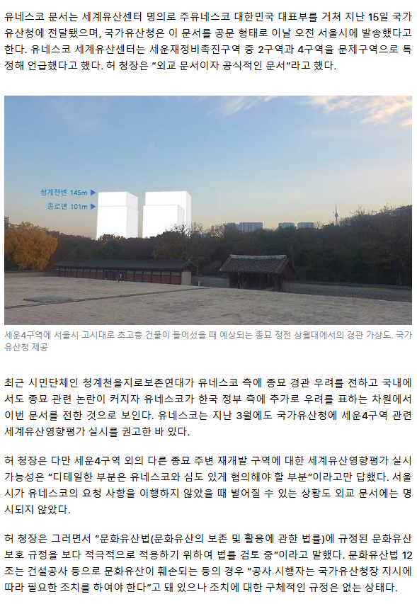 유네스코 "종묘 앞 145m 재개발, 사업 승인 중지하라"
