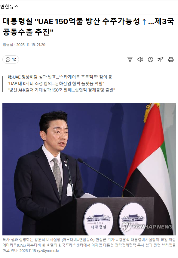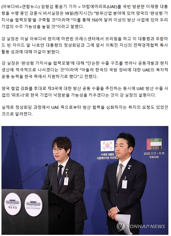 대통령실 "UAE 150억불 방산 수주가능성↑… 제3국 공동수출 추진"