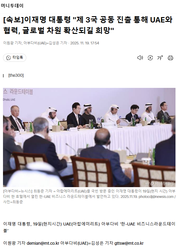 [속보] 이재명 대통령 "제 3국 공동 진출 통해 UAE와 협력, 글로벌 차원 확산되길 희망"