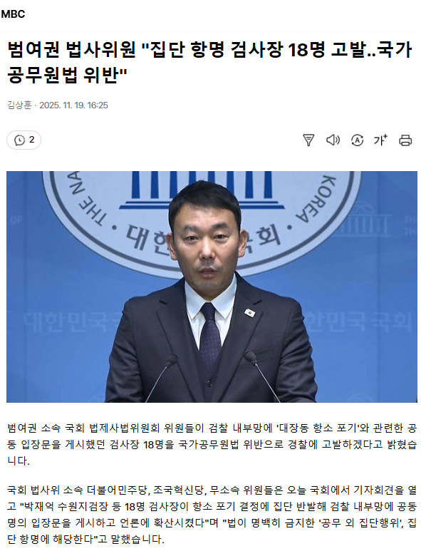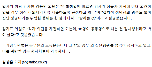 범여권 법사위원 "집단 항명 검사장 18명 고발‥ 국가공무원법 위반" ㅡ 검찰도 공무원