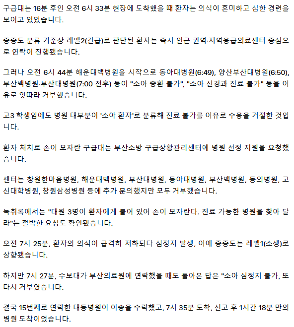 부산 '응급실 뺑뺑이'로 숨진 고교생... 14곳에서 거절당한 뒤 심정지 상태로 병원 도착