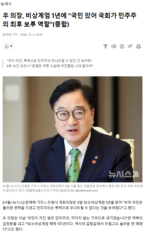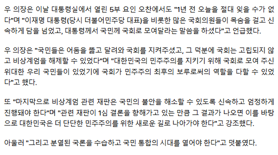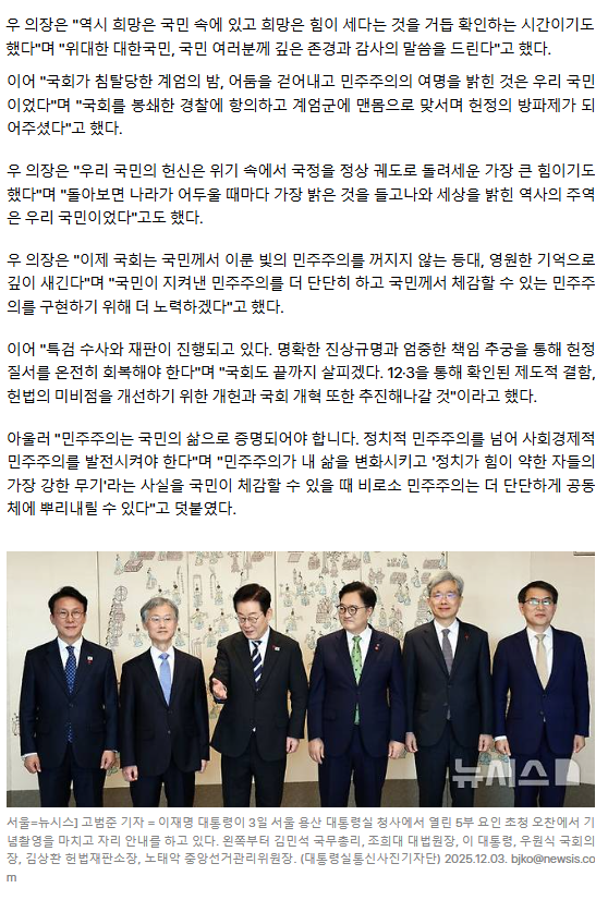 우 의장, 비상계엄 1년에 "국민 있어 국회가 민주주의 최후 보루 역할" (종합)