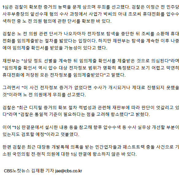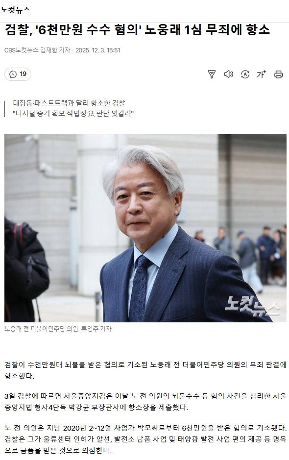검찰, '6천만원 수수 혐의' 노웅래 1심 무죄에 항소 ㅡ 검찰은 선택적 항소하네