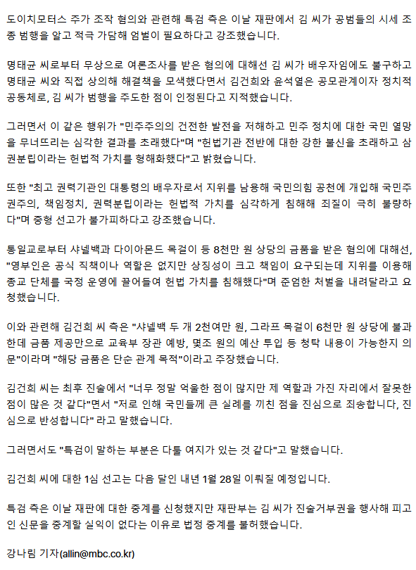 [속보] 특검, 김건희 씨에 징역 15년·벌금 20억 원 구형