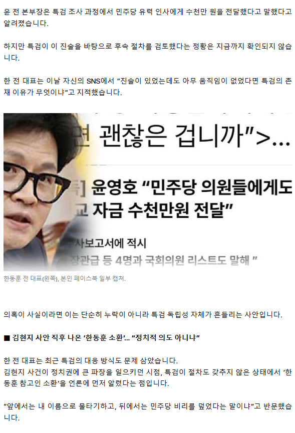 “통일교 돈, 왜 민주당만 비켜갔나”… 한동훈 “민중기 특검도 해산 대상”