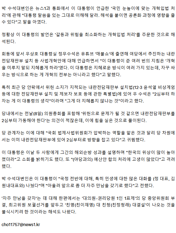 "지혜롭게 입법하시라 합리적으로 개혁 입법하시라 위헌소지가 있다면 내란전담재판부를 2심부터 가동하게 하는것이 맞다"