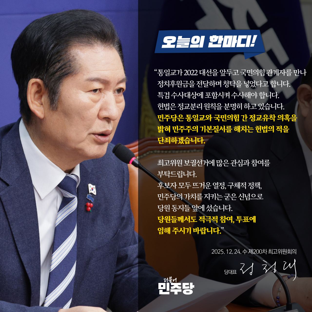 제200차 최고위원회의 모두발언 □ 일시 : 2025년 12월 24일(수) 오전 9시 30분□ 장소 : 국회 본관 당대표회의실 ■ 정청래 당대표 어제 본회의에서 내란전담재판부법이 통과되었습니다. 비로소 내란 재판을 지연하려는 정략을 저지하고 내란 세력을 철저히 단죄하는 진짜 내란 청산의 발판이 마련되었습니다. 또 김건희 특검이 종료되는 즉시, 2차 종합 특검을 추진할 수 있도록 법안을 발의해둔 상태입니다. 내란전담재판부와 2차 종합 특검을 두 바퀴로 삼아, 내란의 잔재를 뿌리 뽑는 그 날까지 달려 가겠습니다. 이번 내란전담재판부는 조희대 대법원장이 내란전담판사를 임명하지 못하도록 원천 차단, 원천 배제했습니다. 박성재, 추경호 등 내란 핵심피의자들의 구속영장을 줄줄이 기각시켰던, 영장전담판사도 바뀌게 됩니다. 여러 악조건 속에서도 내란 전담재판부가 설치되게 되었으니, 추상같은 심판이 이루어지길 기대합니다. 오늘 본회의에서는 허위조작정보 근절법, 정보통신망법 표결이 있을 예정입니다. 우리 민주주의의 토대이고, 헌법상 권리인 표현의 자유에는 개인의 존엄과 공동체의 가치를 해치지 않을 책임을 같이 지고 있습니다. 클릭 한 번으로 삽시간에 퍼져나가는 불법 허위 정보는 혐오, 폭력, 차별을 확산하며 민주주의를 잠식합니다. 악의적 선동으로 혼란을 부추기고, 그 혼란을 이용해 재미를 보려는 무책임한 자유는 방치할 수 없습니다. 불법으로 사익을 추구하는 것도 근절해야 합니다. 고의적 허위·조작 정보와 불법 정보는 단호히 퇴출시키겠습니다. 허위조작정보 근절법은 정당한 표현의 자유와 알 권리 강화로, 건강한 공론장 형성의 토대가 될 것입니다. 통일교 특검으로, 2022년 대선과정에서 자행된 국민의힘의 쪼개기 정치 후원금 수수 의혹과 민원 청탁 의혹의 실상을 낱낱이 밝혀야 합니다. 중앙일보 보도에 따르면, 통일교가 2022년 3월 대선을 닷새 앞두고 국민의힘 핵심 관계자들을 만나 정치후원금을 집중 전달하며 교단의 민원에 대한 청탁을 넣었다는 정황이 확인되었다고 보도하고 있습니다. 국민의힘 시도당위원장 17명 중 14명이 쪼개기식 정치후원금을 받았다는 의혹이 김건희 특검을 통해 드러났다는 것입니다. 잠시 화면을 보시겠습니다. 1지구, 2지구 있는데요, 3지구도 있고 그 밑에도 있습니다. 참조하시기 바랍니다. 보셨습니까? 저 심각한 국민의힘 명단을 보십시오. 싹 다 특검 수사 대상에 포함시켜 철저하게 수사해야 합니다. 그런데 말입니다. 나경원 의원님은 천정궁에 갔습니까? 안 갔습니까? 국민들은 궁금합니다. 나경원 의원도 이 궁금증을 해소하기 위해서 특검 대상에 포함시켜야 하지 않을까요? 또 한 가지가 있습니다. 천정궁 건축 인허가 과정에서 가평군의 특혜 의혹이 있다는 것도 지금 불거지고 있습니다. 역시 특검 대상에 포함시켜야 할 것 같습니다. 정교유착은 우리 헌법에서 엄중히 금지하고 있는 사안입니다. 헌법 제20조 제2항에서 “국교는 인정되지 않으며 종교와 정치는 분리된다”고 명시하여, 정교분리의 원칙을 분명히 하고 있습니다. 또한 헌법 제8조 제4항에서는 “정당의 목적이나 활동이 민주적 기본질서에 위배될 때” 위헌 정당 해산심판대상이 된다고 규정하고 있습니다. 정교 유착은 위헌 그 자체로써, 민주적 기본질서를 정면으로 위배하는 행위입니다. 추경호 전 국민의힘 원내대표의 표결 방해 의혹이 사실로 밝혀지고, 국민의힘과 통일교의 유착이 유죄로 확정이 된다면, 국민의힘은 위헌 정당으로 해산되어야 함을 다시 한번 강조합니다. 더불어민주당은 통일교 특검을 즉각 추진하겠습니다. 국민의힘이 벌써부터 학업에는 관심이 없어 보입니다. 통일교 특검법을 패스트트랙하자며, 패스트트랙을 운운하고 있습니다. 이것은 근데, 패스트트랙은 사실은 슬로우 트랙입니다. 국회법상 최장 330일까지 법안 처리를 지연시킬 수 있는 꼼수 전략일 수 있습니다. 더 이상의 무의미한 잔꾀는 통하지 않을 것입니다. 통일교 특검 좌고우면하지 말고 즉각 실시합시다. 더불어민주당은 통일교와 국민의힘 간의 정교 유착 의혹을 낱낱이 밝혀내어 민주주의의 기본원리를 해치는 ‘헌법의 적’을 단호히 단죄할 것입니다. 어제 해양수산부를 마지막으로, 12일 동안 총 30시간 이상 생중계로 진행되었던 대통령 업무보고가 마무리되었습니다. 넷플릭스보다 더 재미있고 흥미진진하여, 국민들 사이에서 ‘명플릭스, 잼플릭스’라고 불리기도 한답니다. ‘국민주권시대의 대통령 업무보고란 이런 것이다’를 몸소 보여주신 이재명 대통령께 국민의 한 사람으로서 참 고맙다고 감사하다는 말씀드립니다. 국민과의 약속대로 청와대로의 복귀도 계획대로 착착 진행되고 있습니다. 새해부터는 이재명 대통령께서 청와대에서 국정을 운영하는 모습을 국민들께서 보실 수 있을 것입니다. 3년 7개월 만에 정상적인 국가로서의 모습을 되찾고 국격에 맞는 청와대 시대를 다시 여는 것입니다. 일상으로의 회복, 국가정상화의 길, 그 상징적인 모습이 청와대 복귀가 아닐까 생각합니다. 적극 환영하며, 청와대에서 좋은 정치를 해주시기를 바랍니다. 우