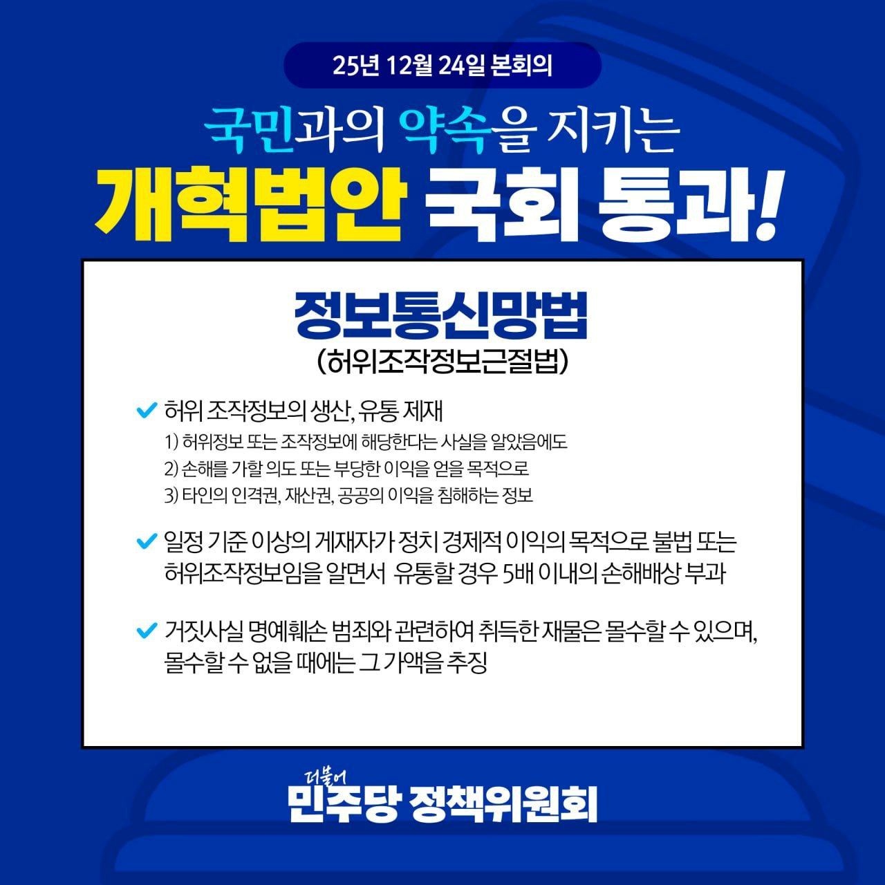 박수현 수석대변인 서면브리핑■ 허위조작정보근절, 국민을 지키는 건전한 민주주의에 책임 있는 한 걸음을 내디뎠습니다 오늘 국회가 ‘허위조작정보 근절법’을 처리함으로써, 허위·조작정보가 만들어내는 국민 피해를 막기 위한 제도적 수단이 마련됐습니다. 국민의 권리를 지키고, 정보 생태계의 공공성을 높이기 위한 책임 있는 한 걸음을 내디뎠습니다. 일각에서는 이를 두고 ‘정부 비판 봉쇄·검열’이라고 주장합니다. 그러나 이는 법안의 취지를 의도적으로 왜곡한 프레임입니다. 이 법이 겨냥하는 것은 ‘비판’이 아니라 악의적·고의적 목적을 띈 유포입니다. 개정안은 고의성 요건을 전제로 하고, 풍자·패러디는 예외로 두는 등 표현의 자유와 비판의 영역을 분명히 구분했습니다. 더 나아가 권력자나 대기업이 비판 보도를 ‘소송으로 봉쇄’하려 한다는 우려에 대한 대책도 이미 마련되어 있습니다. 개정안에는 공익적 비판·감시를 방해할 목적으로 손해배상 소송을 제기할 수 없다는 특칙 등의 장치를 두어 남용 가능성을 제도적으로 차단하도록 했습니다. ‘이중·삼중 제재’라는 비판 역시 개정안의 맥락을 의도적으로 지운 주장입니다. 허위조작정보근절법의 반복유통 제재는 이미 불법이 확정된 조작정보가 확대 재생산되는 상황을 끊어내기 위한 ‘재발방지책’입니다. 규모가 큰 플랫폼 사업자 등의 책임을 강화한 것도 같은 맥락입니다. 알고리즘과 대규모 정보망을 통해 피해가 기하급수로 커지는 시대에, 플랫폼에 최소한의 의무를 부과하는 것은 검열이 아니라 ‘책임의 정상화’입니다. 국민을 속이고 사회를 교란하는 악의적 허위조작정보로부터 국민을 보호하는 입법을 ‘검열’로 둔갑시키는 일각의 주장은, 결국 허위조작정보로 인한 국민 피해를 방치하자는 말과 다르지 않습니다. ‘표현의 자유’는 거짓을 면책하는 권리가 아니라, 민주주의를 지키는 책임과 함께 서야 합니다. 국민의 권리, 정보의 공공성, 건강한 민주주의를 위한 언론개혁은 흔들림 없이 계속될 것입니다. 더불어민주당은 허위·조작정보로부터 국민을 지키고, 공익적 비판과 감시가 위축되지 않도록 제도의 시행에 있어 만전을 기하겠습니다. 2025년 12월 24일더불어민주당 공보국