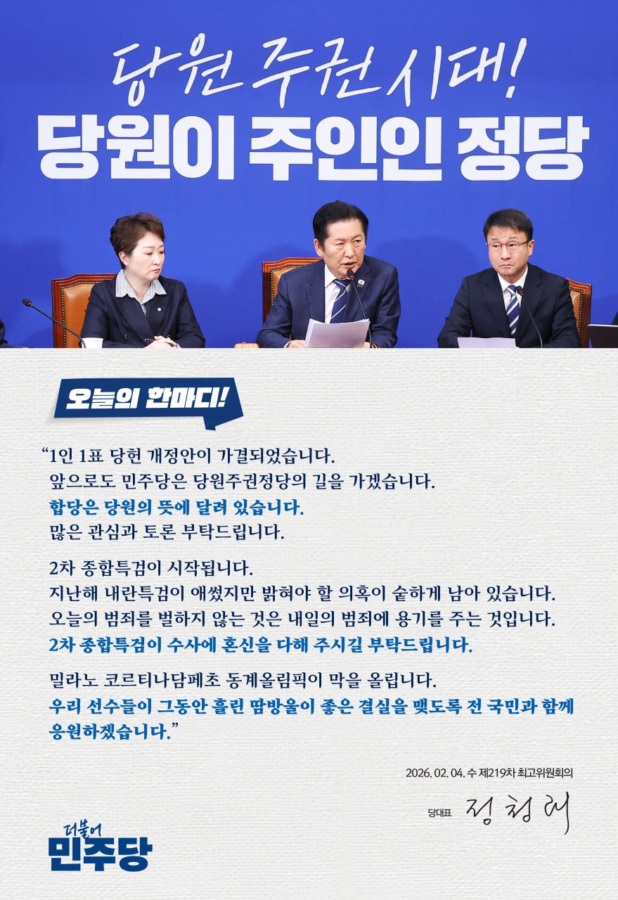 정청래 당대표, 초선의원 간담회 인사말 □ 일시 : 2026년 2월 5일(목) 오후 4시□ 장소 : 국회 본관 제3회의장(245호) ■ 정청래 당대표 여러분 반갑습니다. 바쁘실 텐데 이렇게 많이 참석해 주신 우리 더민초 초선 의원님들께 깊이 감사드립니다. 저는 오늘 경청의 시간을 갖고자 합니다. 제가 말을 많이 하는 것보다는 여러분의 말을 잘 듣고 당의 총의를 수렴해 나가는 과정에 매우 귀중한 의견으로 듣겠습니다. 아시다시피 저는 조국혁신당과의 합당을 제안한 이후로 공개적으로 비공개적으로 많은 의견을 지금 듣고 있습니다. 오늘 초선의원 간담회도 이러한 노력의 연장선상에 있습니다. 제가 긴급 제안 형태로 하다 보니 많은 분들께서 당혹스럽고 또 우려스럽다는 말씀을 많이 해 주신 점에 대해서는 제가 대단히 송구스럽게 생각합니다. 미안하고 그 부분에 대해서는 사과를 드립니다. 이미 수차례 제가 강조했듯이 저는 당대표로서 조국혁신당과의 합당을 제안 드린 것이고 지금 공론화 과정과 수렴 과정을 거치고 있습니다. 때로는 큰 목소리로 때로는 작은 목소리로 저에게 많은 의견을 전해주고 계십니다. 다 금과옥조와 같은 소중한 의견들이라고 생각합니다. 예전 제왕적 총재 시절에는 당 총재가 합당을 혼자 결정하고 혼자 선언하는 형태였습니다. 지금은 김대중 총재가 와도 그렇게 할 수 없는 당원이 주인인 정당, 민주적 정당, 당내 민주주의가 온전히 실현되는 정당입니다. 따라서 이 문제는 저 혼자 결정할 수 없는 사안입니다. 이 부분에 대해서는 당헌·당규상 최종 의사결정권은 전당원 투표와 수임기구 또는 전당대회를 통해서 결정하게 되어 있습니다. 이러한 민주적 절차 과정을 거치지 않고 그 어느 것 하나, 무엇 하나 결정할 수는 없습니다. 전당원 토론과 전당원 투표도 당원들의 의사에 따라서 민주적으로 진행되는 부분이라고 당헌·당규에 엄연히 규정하고 있습니다. 나라의 주인은 국민이듯이 더불어민주당의 주인은 당원입니다. 조국혁신당과의 합당 문제도 당원 뜻대로 결정될 것이고 당원들이 가라면 가고 멈추라면 멈추겠다고 여러 차례 제가 말씀을 드린 바 있습니다. 엊그제, 1인 1표 제도가 당원들의 85.3% 그리고 중앙위 60% 의결로 결정되었습니다. 이제 더불어민주당은 명실공히 당원 주권 시대에 걸맞은 당원이 주인인 정당으로 거듭나고 있습니다. 이번 지방선거 공천도 일대 공천 혁명이라 할 정도로 당원들에게 공천권을 돌려주었고 당대표 또한 당대표가 갖고 있는 기득권을 내려놓았습니다. 이제 더불어민주당은 명실공히 그야말로 당원이 모든 것을 결정하는 시대가 되었고 당원들이 이번 지방선거 공천 경선 과정에도 전면적으로 참여하게 됩니다. 우리는 하나로 뭉칠 때 승리하고 분열할 때 패배했던 역사적 사실을 기억하고 있습니다. 지금은 지방선거를 4개월 앞두고 있는 매우 긴박한 시기입니다. 지난 5년 전 선거처럼 2~3%의 차이로 질 수는 없습니다. 1표, 1표가 아쉬운 상황이고 여기 계신 의원님들께서도 선거 과정 속에서 상가 문을 열고 들어가서 사장님 한 분, 한 분에게 절실하고 간절한 마음으로 1표를 호소했던 기억이 생생하실 겁니다. 쉬운 선거는 없습니다. 선거에서 낙관은 패배의 지름길입니다. 어떤 선거도 쉬운 선거가 없듯이 매우 절실한 마음으로 간절한 마음으로 1표, 1표 끝까지 간절한 마음을 호소해야 합니다. 제가 조사를 해봤습니다. 과거 6차례 지방선거에서 동일 득표, 동점자로 결과가 나와서 연장자가 당선된 경우가 7번 있었습니다. 1표 차이로 승패가 갈린 경우는 13번 있었습니다. 그리고 어떤 국회의원 선거에서는 3표 차로 승부가 갈리기도 했습니다. 그래서 선거는 끝까지 최선을 다해야 되고 흔히 하는 말로 골프와 선거는 고개를 쳐들면 진다는 말도 있습니다. 근거 없는 승리에 대한 낙관보다는 끝까지 절실한 마음으로 최후까지 최선을 다하는 마음을 가져야 되지 않을까 생각합니다. 저는 이런 절박한 심정으로 지방선거 승리와 이재명 정부 성공을 위해서 나름 고심 끝에 제안을 했습니다. 그리고 지금까지 여러 날이 지나면서 많은 의견을 청취하고 있습니다. 오늘 초선 의원님들께서 귀한 의견을 주시기 바랍니다. 오늘은 제가 의원님들께서 하시는 말씀을 주로 경청하는 시간을 갖도록 하고 가급적이면 비공개 때는 제가 말을 아끼고 말을 많이 듣도록 하겠습니다. 오늘 참석하신 의원님들께 감사드립니다. 고맙습니다. 2026년 2월 5일더불어민주당 공보국