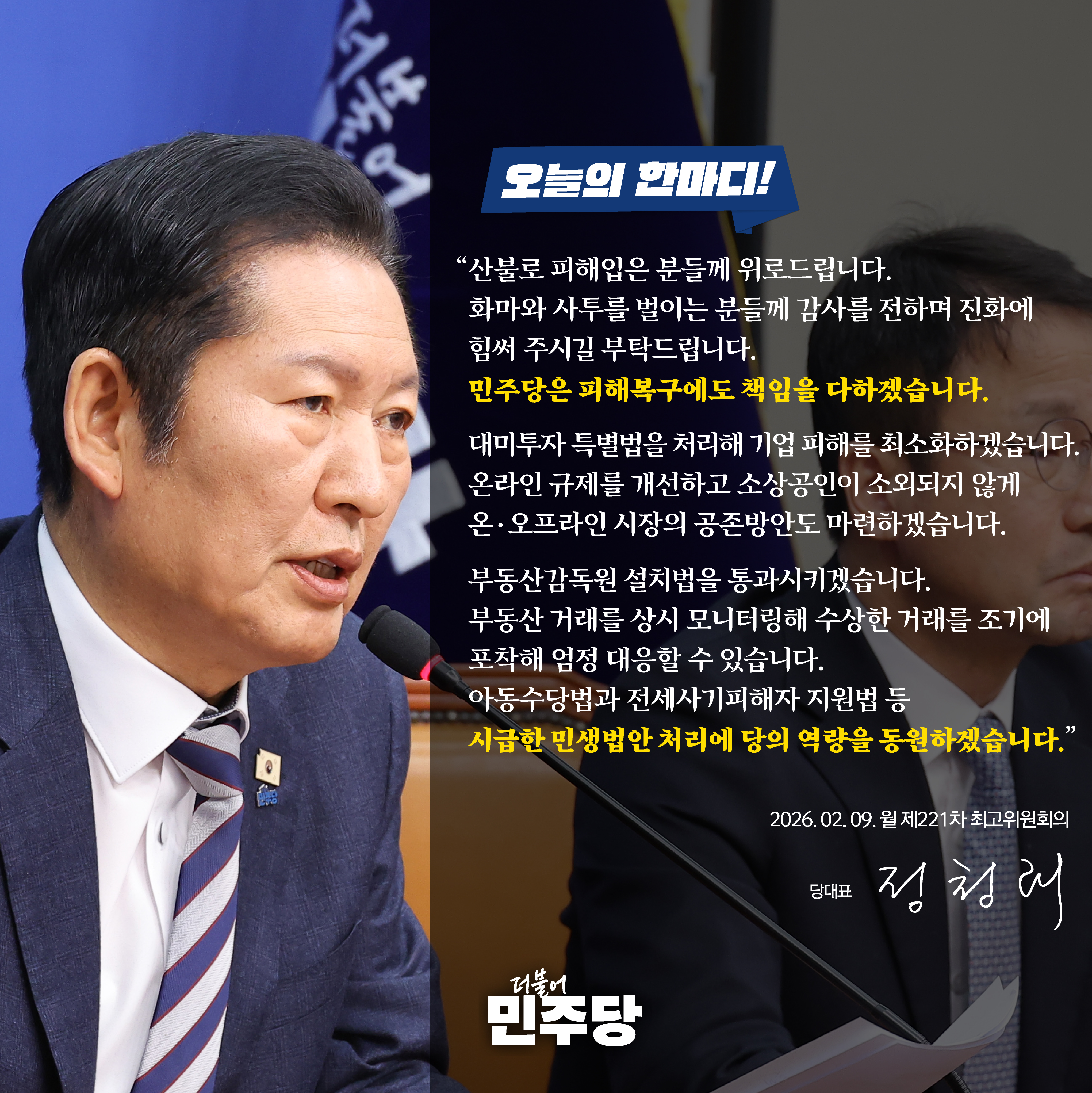 제221차 최고위원회의 모두발언 □ 일시 : 2026년 2월 9일(월) 오전 9시 30분□ 장소 : 국회 본관 당대표회의실 ■ 정청래 당대표 전국 곳곳에 산불로 피해를 입은 분들께 위로의 말씀을 드립니다. 강풍으로 불길을 잡기 어려운 상황 속에서도 화마와 사투를 벌이고 계신 모든 분들께 감사를 전하며 완전한 진화를 위해 끝까지 힘써 주시길 부탁드립니다. 국민 여러분께서 하루빨리 일상을 되찾을 수 있도록 민주당은 정부와 함께 피해 복구에도 책임을 다하겠습니다. 어제 제6차 고위당정협의회가 있었습니다. 고위당정협의회에서 당·정·청은 민생·경제 핵심 과제들을 해결하기 위해 머리를 맞댔습니다. 가장 시급한 현안은 관세 재인상 우려로 혼란을 겪고 있는 우리 기업들을 보호하는 것입니다. 민주당은 대외적 불확실성을 제거하기 위해 3월 초까지 대미 투자 특별법을 처리하여 우리 기업의 피해를 최소화할 수 있도록 최선을 다하겠습니다. 또한 유통산업의 규제 불균형을 해소하고 소비자의 선택권을 확대하기 위해 대형마트 등의 온라인 규제를 개선하기로 뜻을 모았습니다. 이 과정에서 소상공인이 소외되지 않도록 현장의 목소리를 경청하며 온·오프라인 시장이 공존할 수 있는 상생 방안도 빈틈없이 마련하겠습니다. 어제 특별히 전통시장 상인들의 생존권과도 관련이 있는 문제인 만큼, 이 부분에 대한 보완을 확실하게 하자고 당에서 요구도 했고 당·정·청이 이 부분에 대해서 인식을 같이 했다는 점을 말씀드립니다. 이재명 대통령께서 부동산 집값 잡기에 올인하고 있습니다. 이재명 정부는 부동산 투기와의 전쟁에서 반드시 승리하겠습니다. 정부에서 추진하고 있는 부동산감독원 설치법을 가장 빠른 시일 안에 통과시키겠습니다. 부동산감독원이 설치되면 금융감독원에서 금융거래 실태를 감독하듯이 부동산 시장의 구조적인 문제인 가격 급등과 급락, 불공정 거래의 관행을 바로잡고 상시적인 부동산 시장의 현황을 모니터링하며 불법적인 가격 담합, 호가 부풀리기 등도 단속 대상이 될 것입니다. 부동산 거래를 상시적으로 모니터링해 실거래 신고 자료, 등기, 대출, 세금 정보 등을 연계해 분석해서 단기간 반복 매매, 고가 편중 거래 등 수상한 거래를 조기에 포착해 엄중 대응할 수 있을 것입니다. 불법·편법 거래에 대한 엄정한 감독을 통해 실수요자를 보호하고 시장의 신뢰를 회복시키는 데 기여할 것입니다. 앞으로 불법적인 부동산 투기 세력은 꿈도 꾸지 마시기 바랍니다. 불법적인 부동산 투기 세력들의 불법이 확인되면 패가망신도 각오해야 할 것입니다. 이재명 정부는 분명하게 말씀드립니다. 이전의 정부와는 다른 부동산 정책으로 부동산 안정 대책, 집값 안정을 반드시 일궈내겠습니다. 이재명 정부의 성공을 뒷받침할 2월 임시국회 입법 전략도 구체화했습니다. 아동수당법과 전세사기피해자지원법 등 시급한 민생 법안 처리에 당의 역량을 총동원하겠습니다. 지금껏 그래왔듯 올해도 당·정·청은 한 몸처럼 움직이겠습니다. 변함없는 원팀 정신으로 대한민국의 대도약을 힘차게 견인하겠습니다. 오늘부터 시작되는 대정부질문은 이재명 정부의 저력을 확인하는 자리가 될 것입니다. 지난 8개월 이재명 정부는 내란의 혼란을 극복하고 대한민국을 정상화하는 데 매진해 왔습니다. 헌정질서 회복, 당당한 외교 복귀, 코스피 5000 돌파와 내수 활성화 등 가시적인 성과가 넘쳐나고 있습니다. 앞으로도 민주당은 이재명 정부의 성공을 든든하게 뒷받침하며 미완의 내란 청산을 매듭짓고 민생 개혁을 완수하는 데 앞장서겠습니다. 대장동 50억 클럽 곽상도 전 의원 부자 뇌물수수 혐의에 무죄를 안겨준 재판부는 정말 국민 앞에 떳떳합니까? 사법부에서 계속 이런 짓을 하니 사법부가 불신을 받고 있는 것 아니겠습니까? 실세의 국회의원 아버지가 없었다면 일개 회사 6년 차 대리에 불과했던 곽상도 전 의원의 아들이 퇴직금 명목으로 50억 원을 받을 수 있었겠습니까? 이것이 무죄입니까? 재판부는 이제 뇌물은 퇴직금으로 달라는 국민의 분노를 직시해야 합니다. 사법 신뢰를 스스로 무너뜨린 상황에 무거운 책임을 느껴야 합니다. 검찰도 마찬가지입니다. 곽상도 전 의원의 50억 범죄수익 은닉 혐의는 공소권 남용을 이유로 공소기각되었습니다. 검사 출신에 민정수석까지 했던 거물 전관인 곽 의원에게 혹시 부실 수사, 부실 기소로 퇴로를 마련해 준 것 아닙니까? 설령 아니라고 하더라도 무능한 검찰이라는 비판에서 자유로울 수 없습니다. 이러니 검찰 개혁, 사법개혁 하자는 겁니다. 민주당은 2월 임시국회에서 반드시 법왜곡죄, 재판소원 등 사법개혁을 완수하겠습니다. 검찰 개혁도 차질 없이 준비하겠습니다. 법이 평범한 국민이 아닌 강자, 권력자의 편에 서는 비정상을 반드시 바로잡겠습니다. 감사합니다. ■ 한병도 원내대표 국회는 오늘부터 사흘동안 대정부질문을 진행합니다. 민주당은 ‘이재명 정부의 성공이 곧 국민의 성공’이라는 원칙 아래 시급한 설 민생대책과 소상공인·중소기업 지원, 부동산 후속대책 등 현안을 꼼꼼히 짚으며 합리적 대안을 제시하겠습니다. 여야