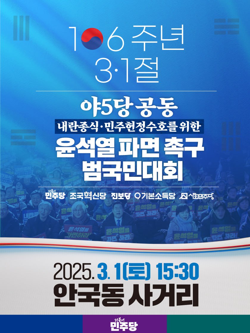 - 2025년03월01일(토) 15시30분 야5당 공동 윤석열 파면 촉구 범국민대회