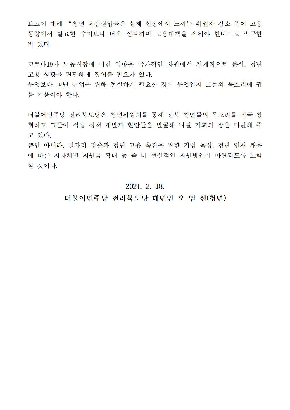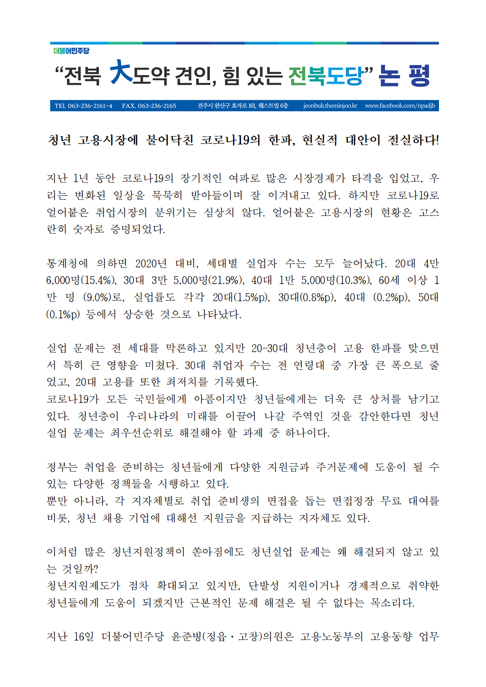 [논평]청년 고용시장에 불어닥친 코로나19의 한파, 현실적 대안이 절실하다!