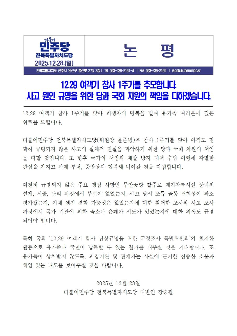 [논평]12.29 여객기 참사 1주기를 추모합니다.