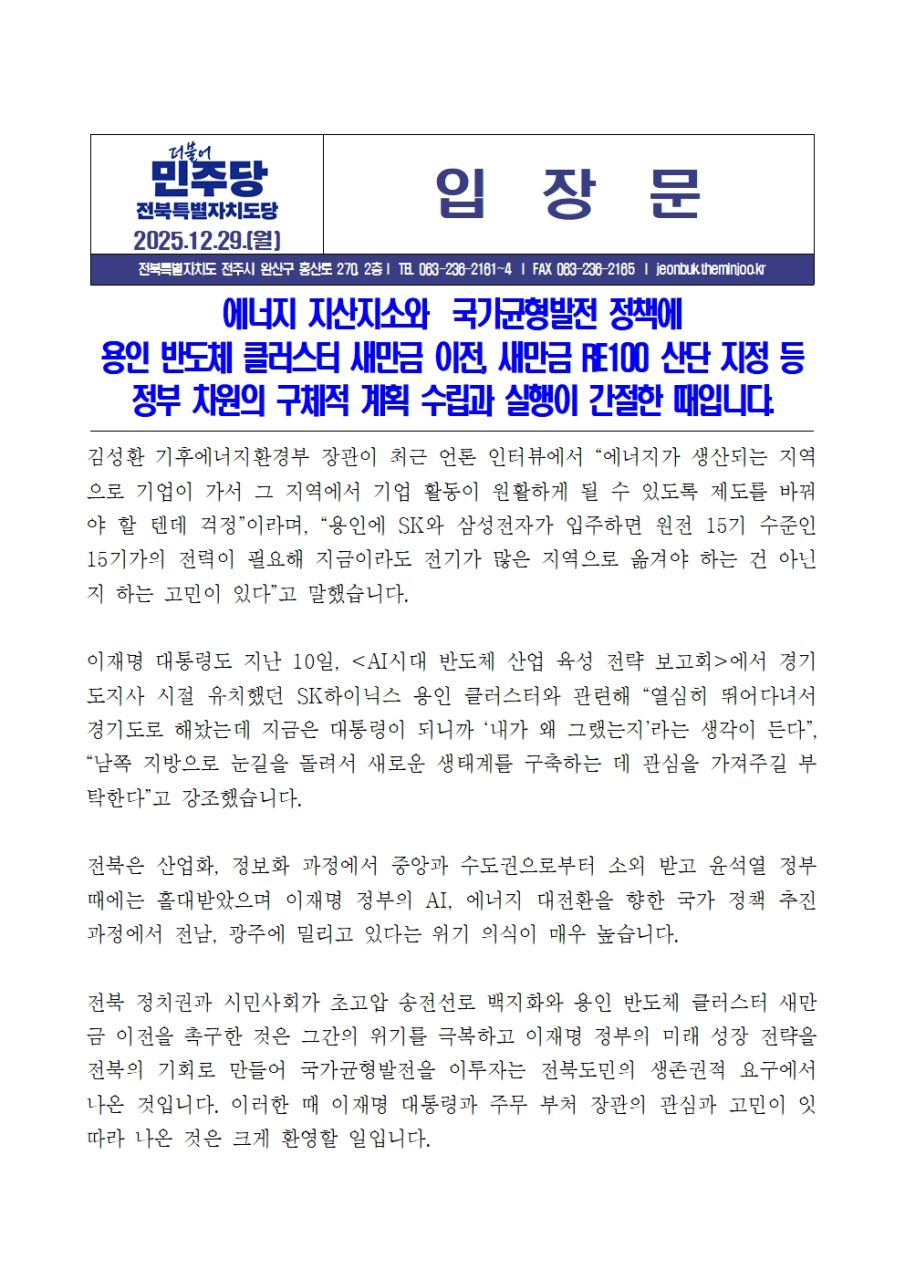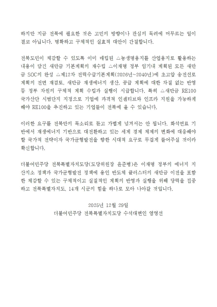[입장문] 에너지 지산지소와 국가균형발전 정책에 용인 반도체 클러스터 새만금 이전, 새만금 RE100 산단 지정 등 정부 차원의 구체적 계획 수립과 실행이 간절한 때입니다.