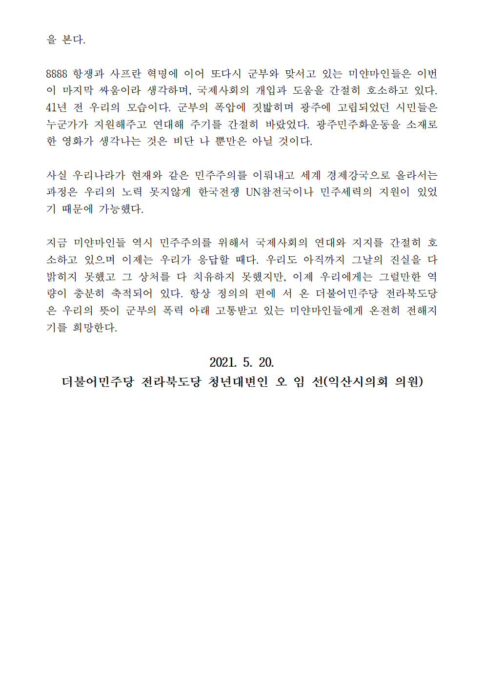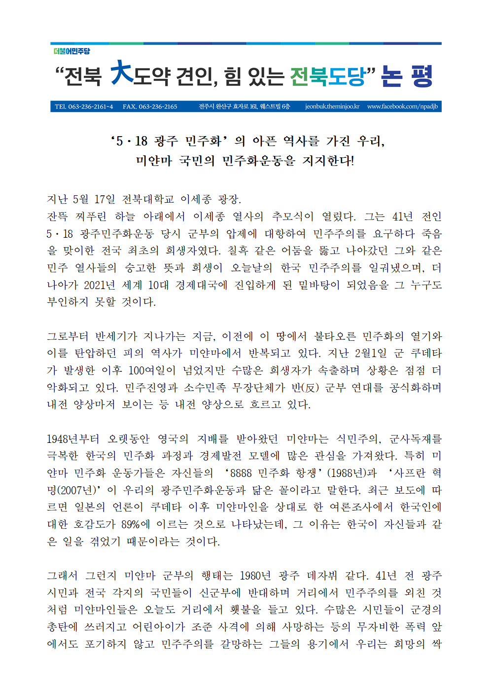[논평] ‘5·18 광주 민주화’의 아픈 역사를 가진 우리, 미얀마 국민의 민주화운동을 지지한다!