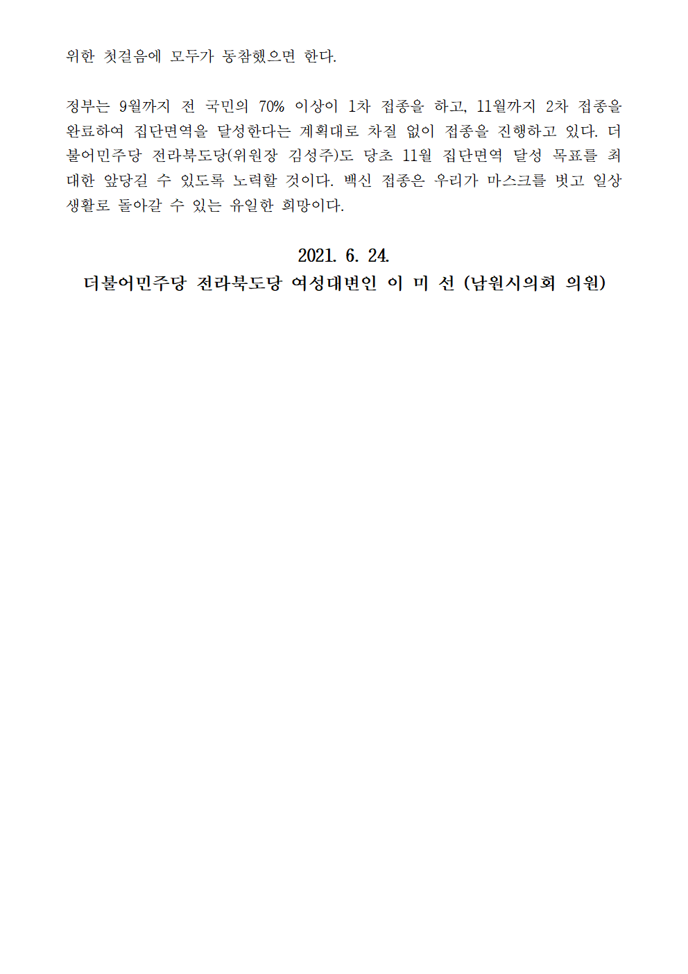 [논평] 일상 복귀의 유일한 희망, 백신 접종!