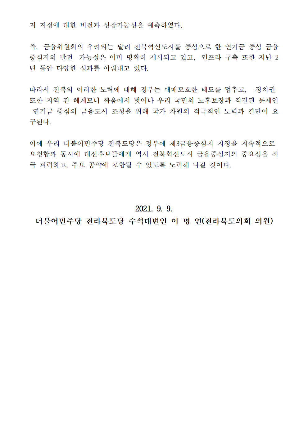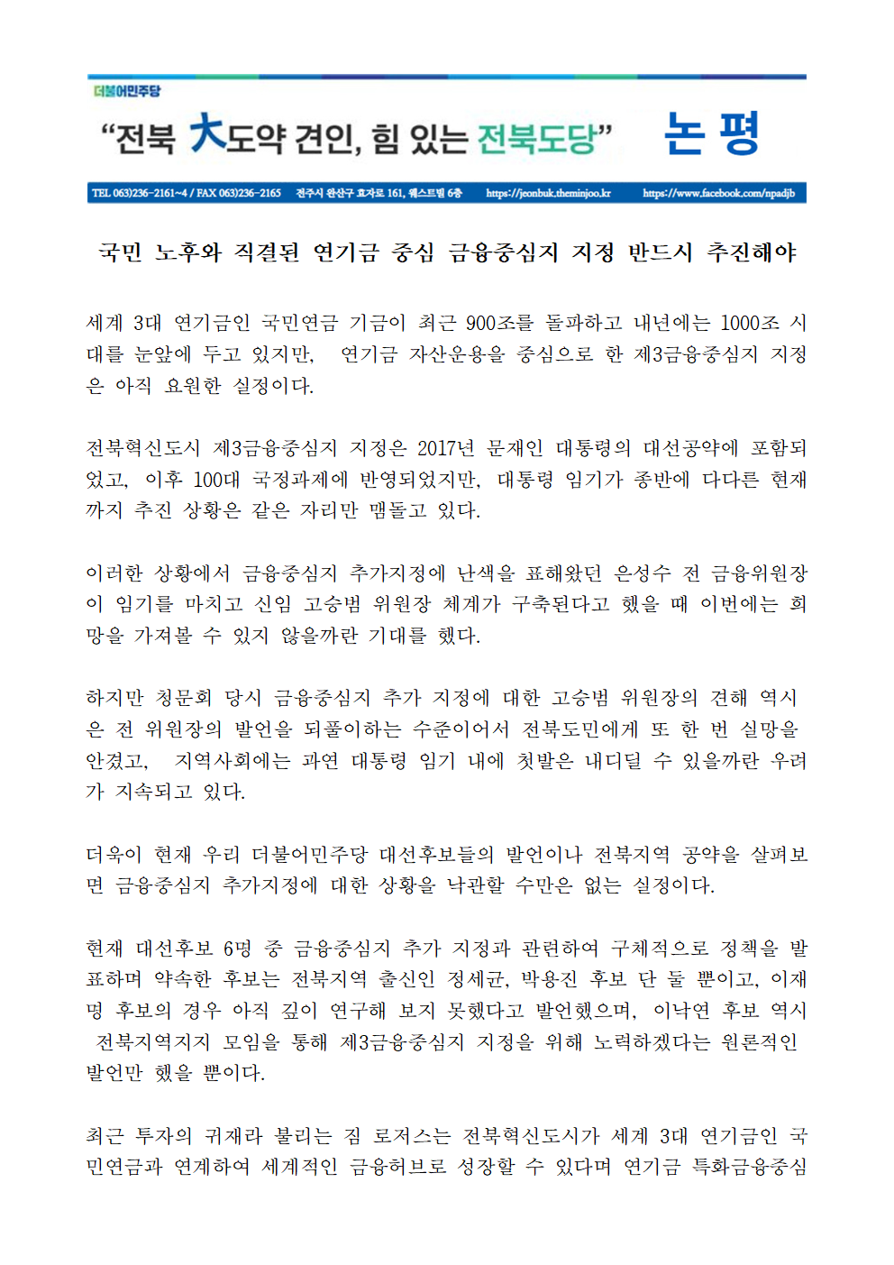 [논평] 국민 노후와 직결된 연기금 중심 금융중심지 지정 반드시 추진해야 - 이명연 수석대변인(전라북도의회 의원)