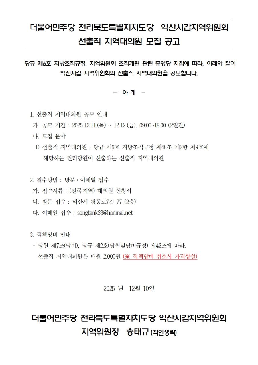 익산시갑지역위원회 선출직 지역대의원 모집 공고