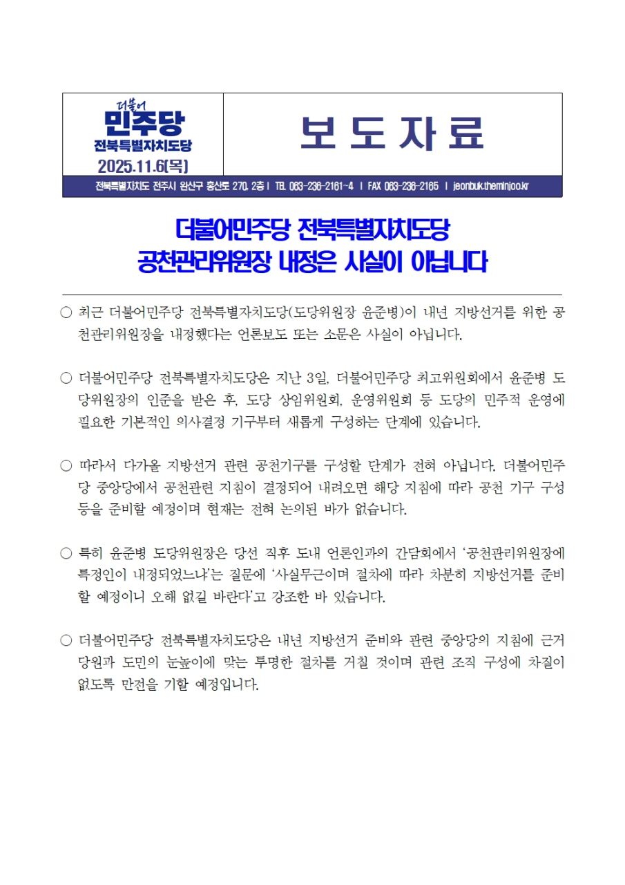 [보도자료]더불어민주당 전북특별자치도당 공천관리위원장 내정은 사실이 아닙니다