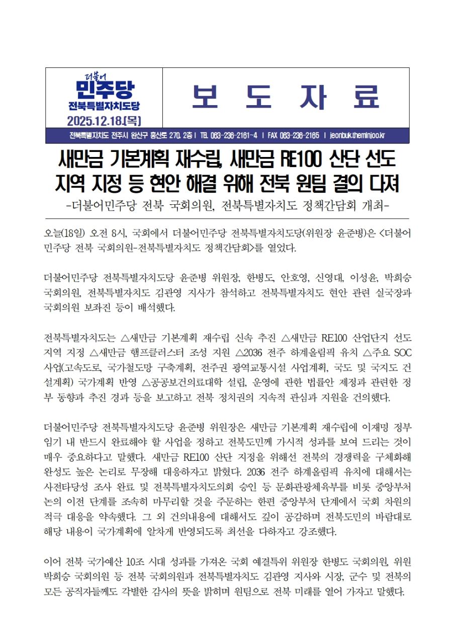 [보도자료]-더불어민주당 전북 국회의원, 전북특별자치도 정책간담회 개최