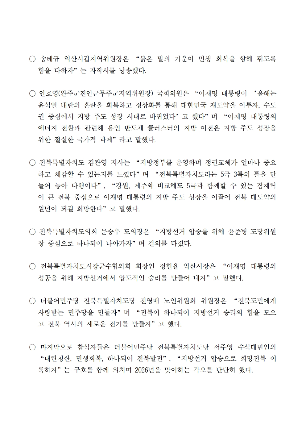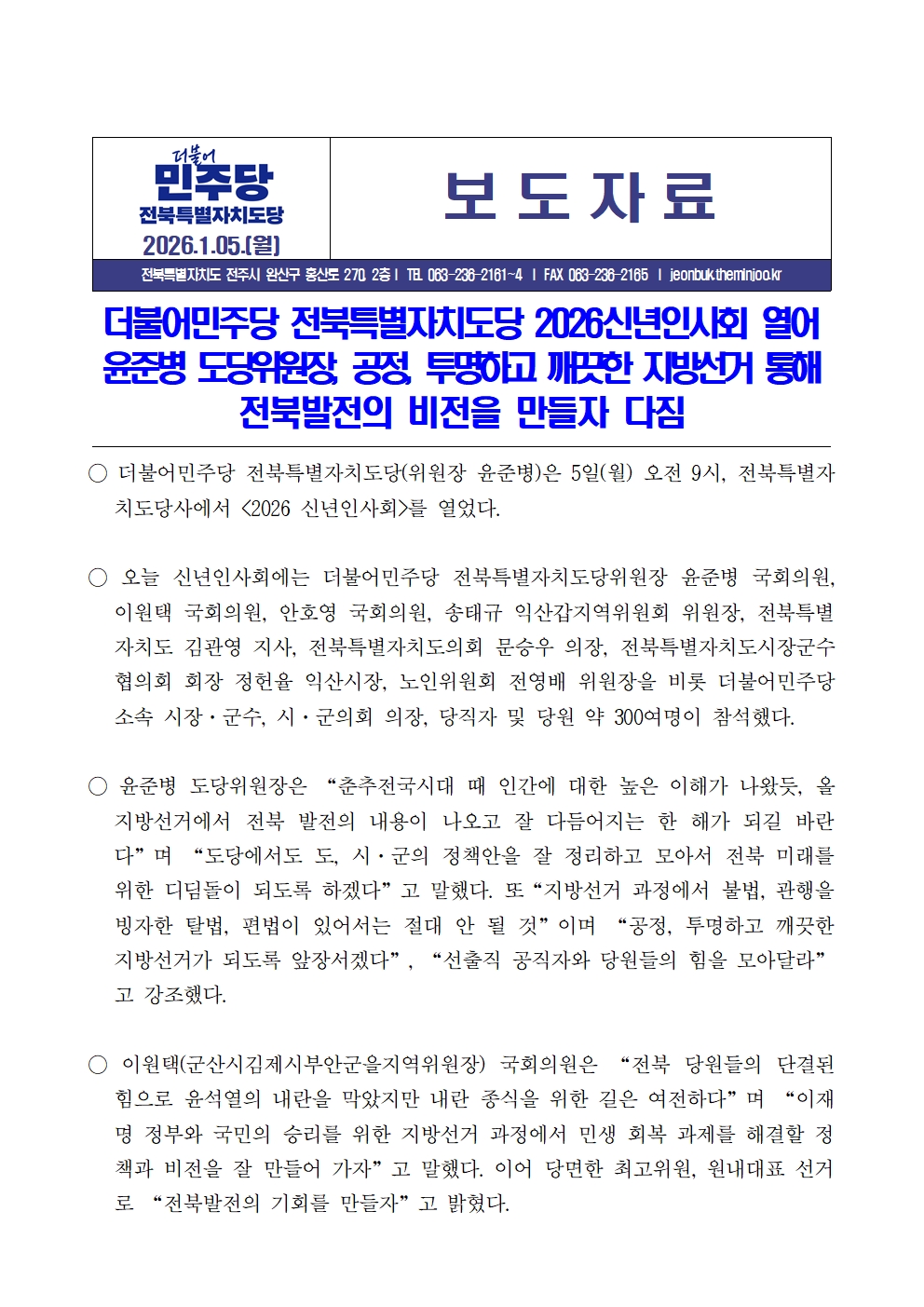 [보도자료]더불어민주당 전북특별자치도당, 신년인사회서 '공정, 투명하고 깨끗한 지방선거 통해 전북발전의 비전 만들자' 다짐