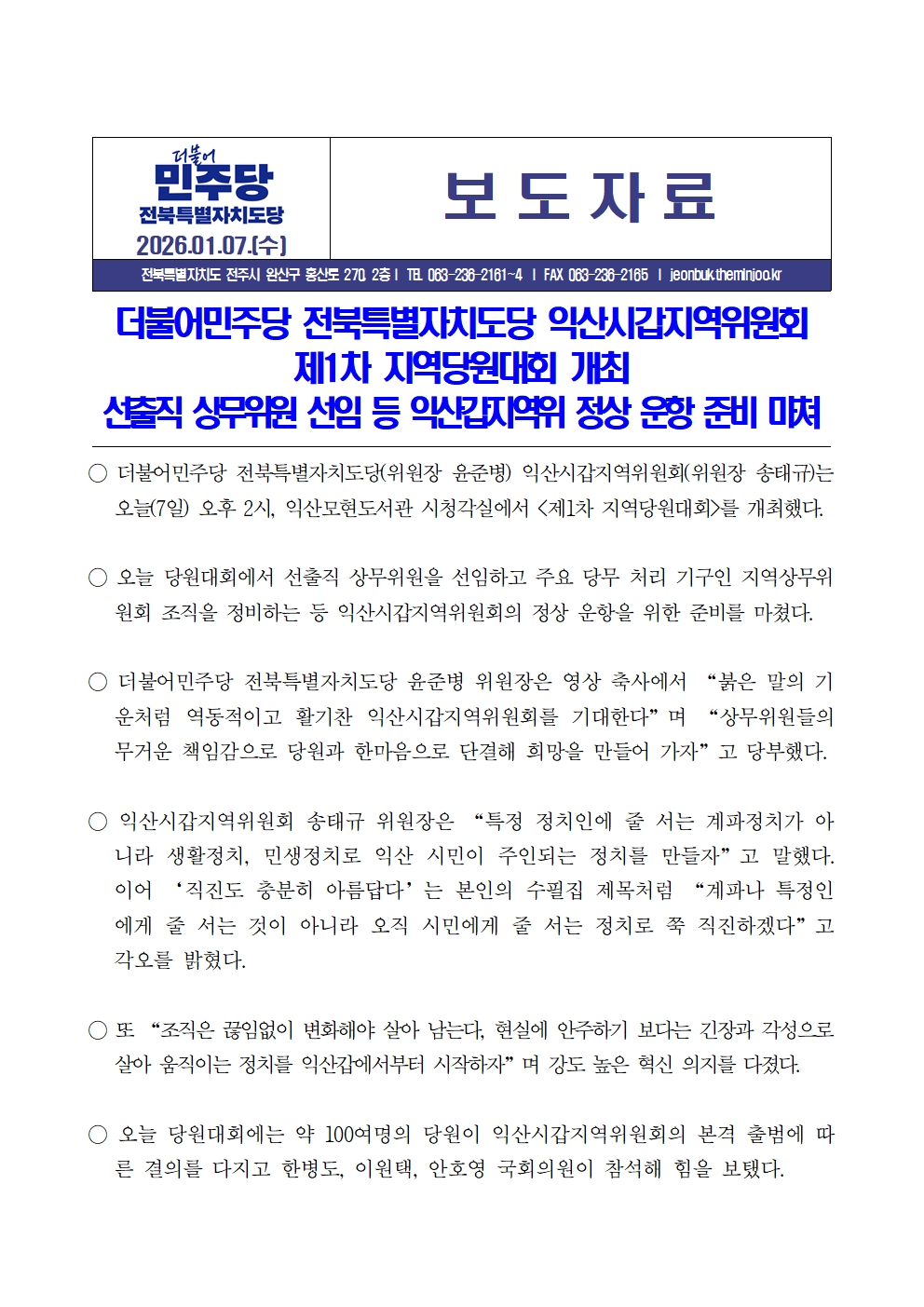 260107[보도자료]익산갑지역위원회1차당원대회.hwp