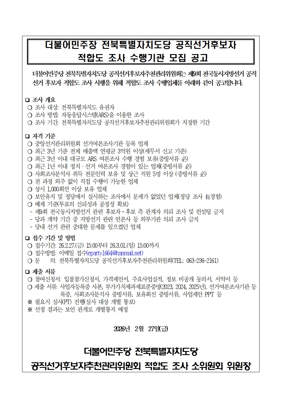 전북특별자치도당 공직선거후보자 적합도 조사 수행기관 모집 공고