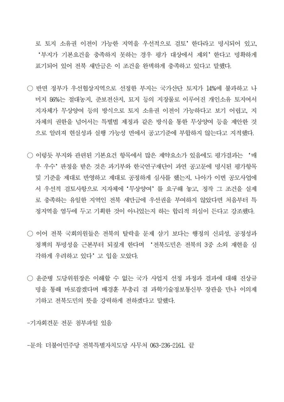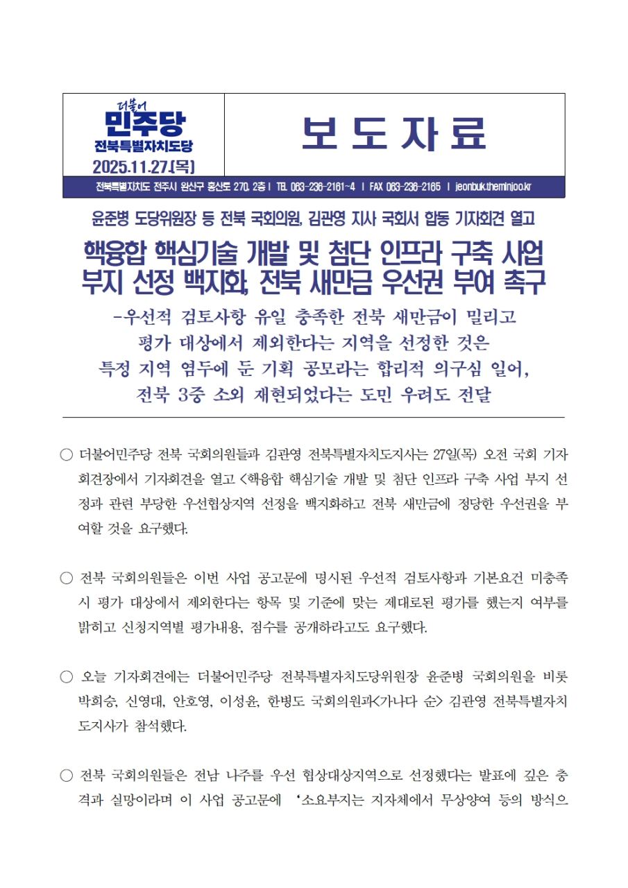 [보도자료]핵융합 핵심기술 개발 및 첨단 인프라 구축 사업 부지 선정 백지화, 전북 새만금 우선권 부여 촉구