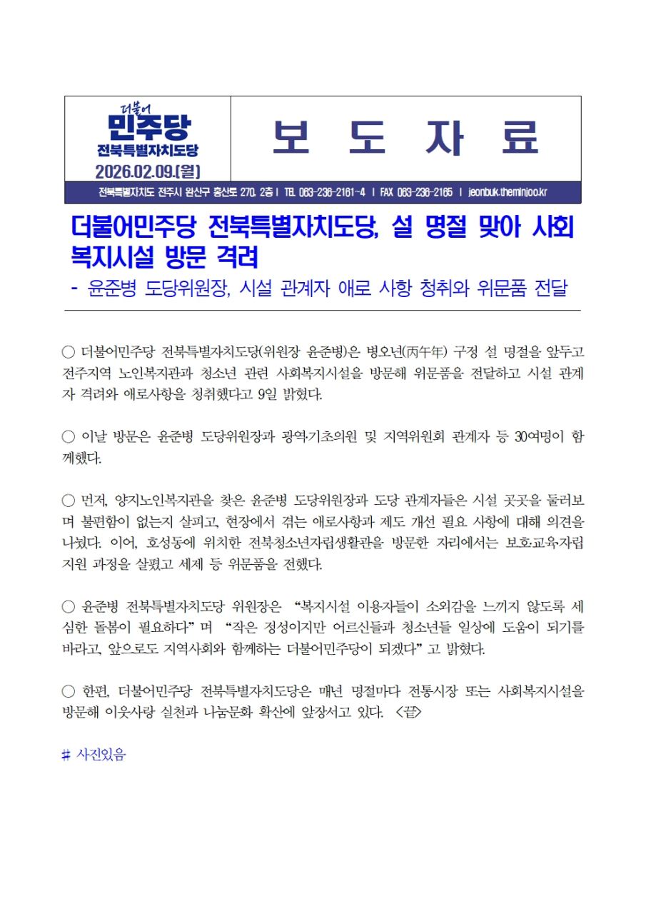 260209[보도자료]더불어민주당 전북특별자치도당, 설명절 맞아 사회복지 시설 방문 격려