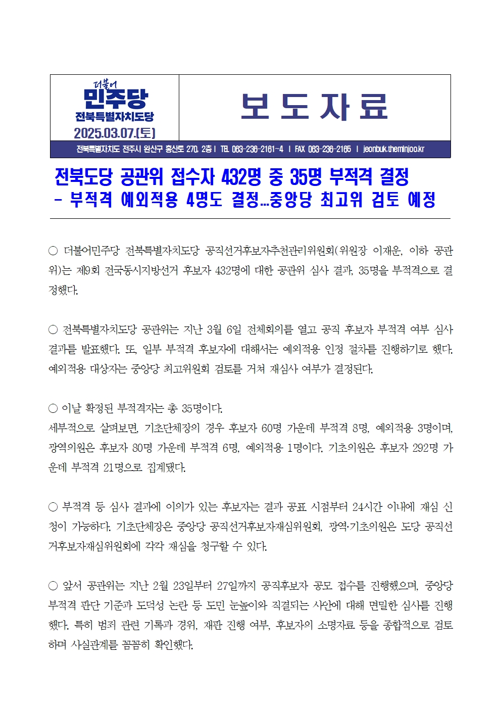 260307[보도자료]더불어민주당 전북도당 공관위, 6.3지방선거 부적격자 결정