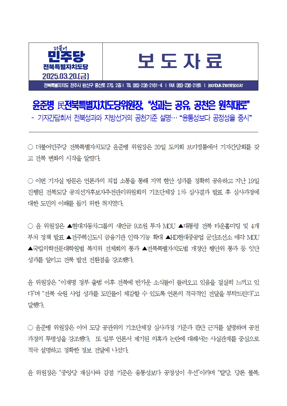 260320[보도자료] 윤준병 民전북특별자치도당위원장, 성과는 공유, 공천은 원칙대로