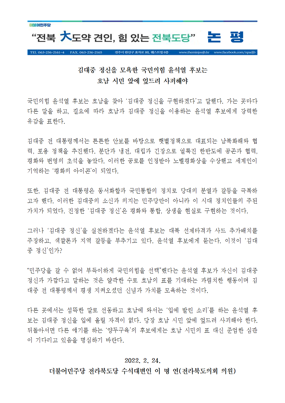 [논평] 김대중 정신을 모욕한 국민의힘 윤석열 후보는 호남 시민 앞에 엎드려 사죄해야