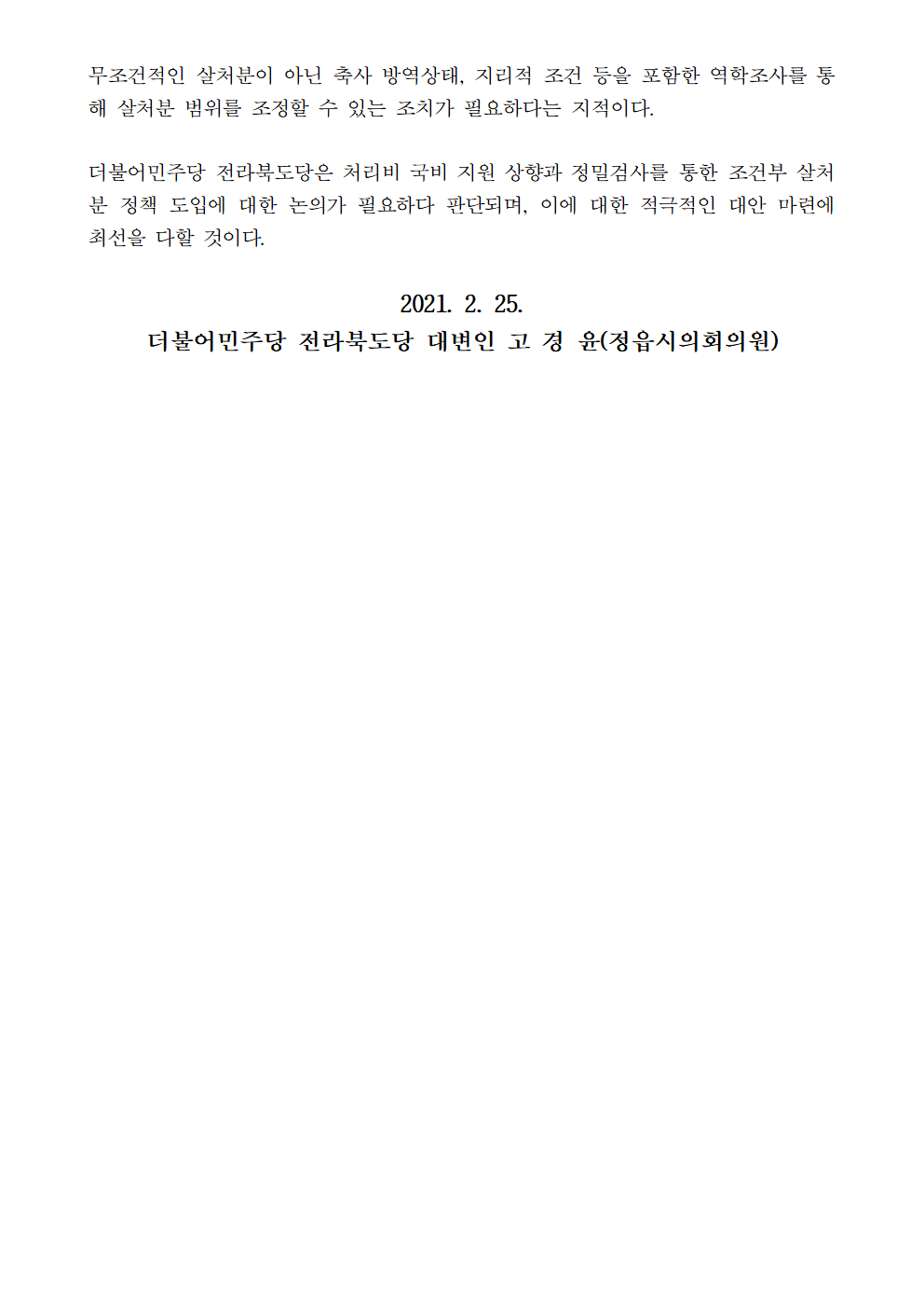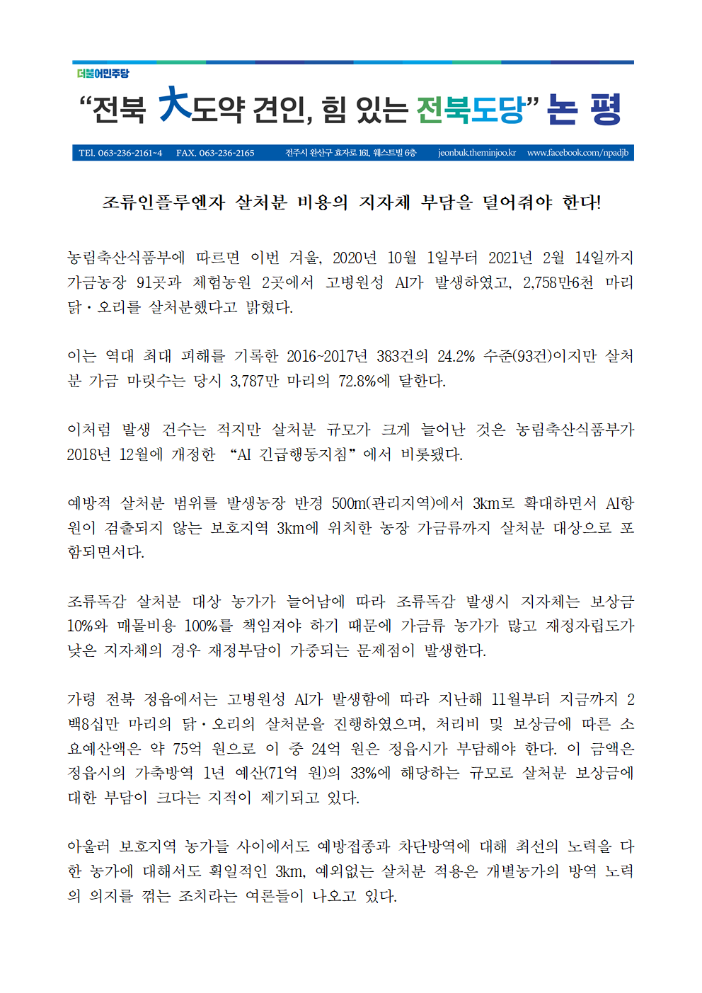 [논평] 조류인플루엔자 살처분 비용의 지자체 부담을 덜어줘야 한다