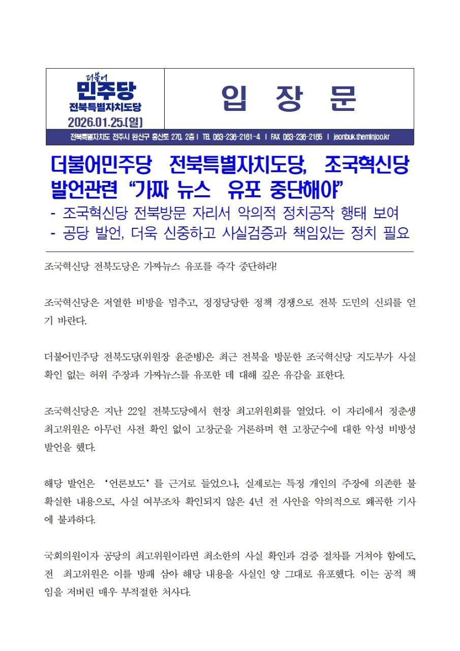 260125[입장문]더불어민주당 전북특별자치도당, 조국혁신당 악의적 정치 공작 멈춰야