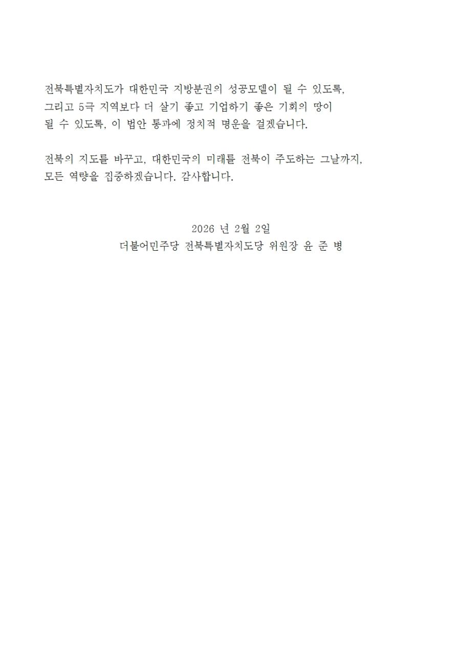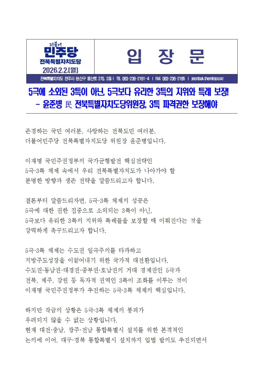 260202[입장문]더불어민주당 전북특별자치도당 윤준병 위원장 5극보다 유리한 3측 전북특별자치도가 답.hwp